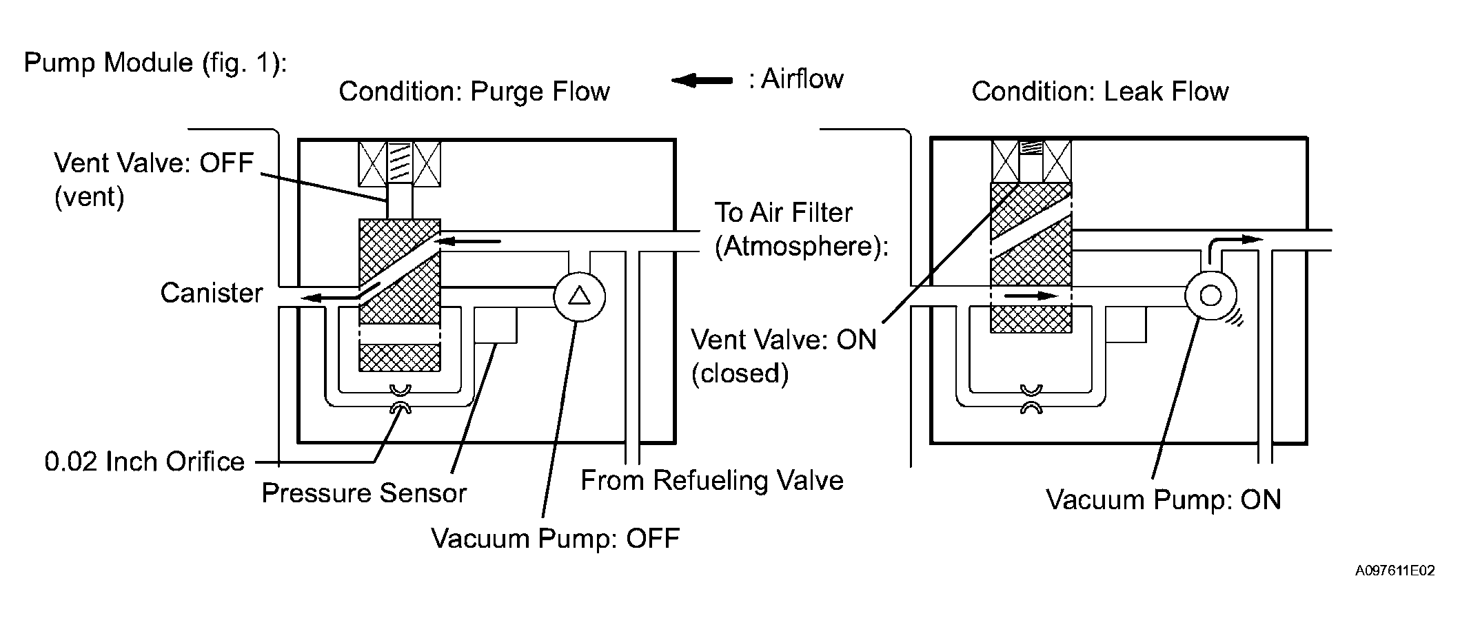 The purge flow volume is also determined by the intake manifold pressure. Atmospheric pressure is allowed into the canister through the vent valve to ensure that the purge flow is maintained when the negative pressure (vacuum) is applied to the canister.