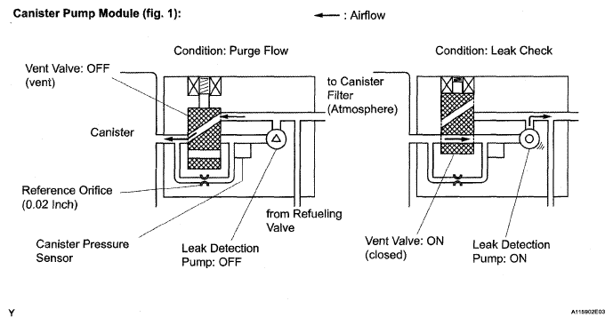 | (e) Reference orifice | Diameter is 0.02 inch. Negative pressure (vacuum) is created in reference orifice to measure reference pressure by closing purge VSV, turning off vent valve (vent) and operating leak detection pump. Reference pressure indicates criterion of EVAP small leak. |