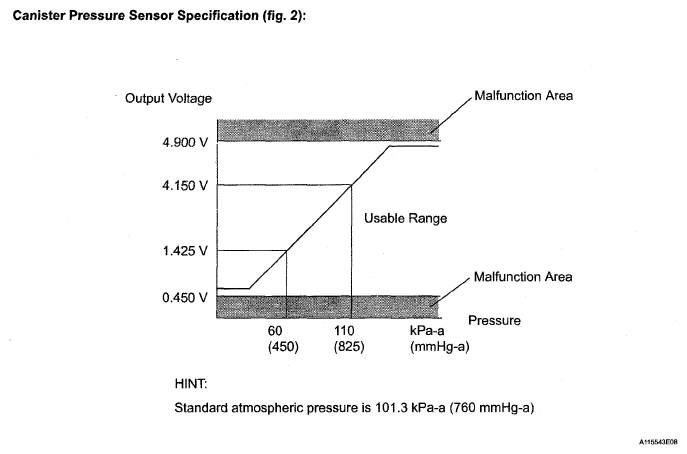 | (b) Canister pressure sensor | Indicates EVAP pressure as voltage 5 V is applied by ECM. ECM detects EVAP system pressure using this voltage (refer to Fig 4). |