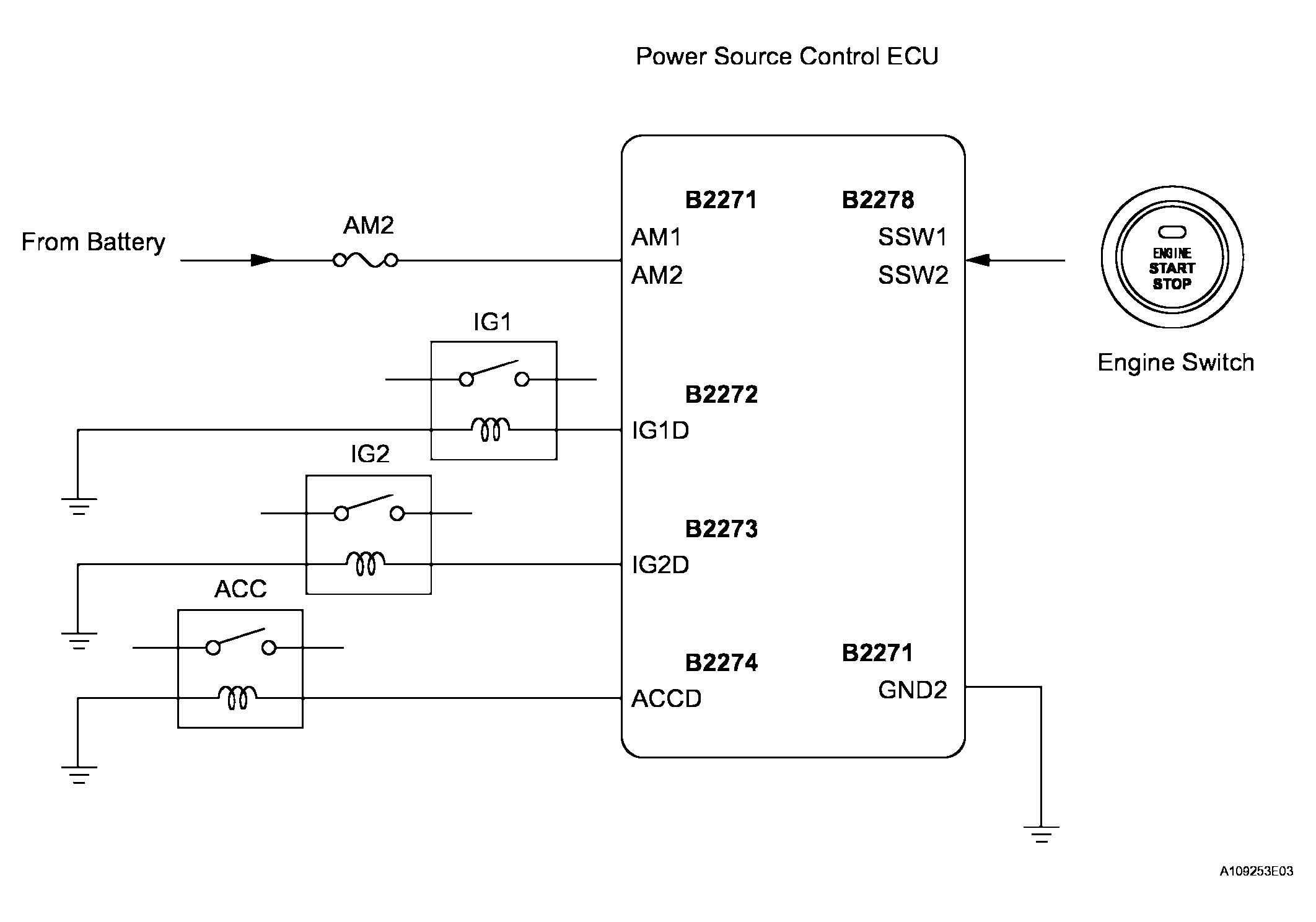 If the certification ECU detects the key inside the vehicle when the shift lever position is P (A/T) and the brake pedal (A/T) or the clutch pedal (M/T) is not depressed, each press of the engine switch changes the power source mode in the following order: off, on (ACC), on (IG), off. If one of the DTCs shown in Figure is detected, correct the DTCs according to the DIAGNOSTIC TROUBLE CODE TABLE . If the power source mode is still malfunctioning, one of the following may have occurred: 1) the MPX circuit has a malfunction, 2) the certification ECU has determined that the electrical key is not inside the vehicle, 3) the engine switch has a malfunction, or 4) the power source control ECU has a malfunction.