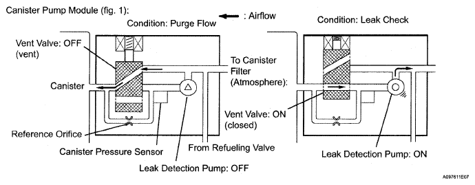 The leak detection pump creates negative pressure (vacuum) in the EVAP system and the pressure is measured. Finally, the ECM monitors for leaks from the EVAP system and malfunctions in both the canister pump module and purge VSV based on the EVAP pressure.