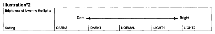 LIGHT CONTROL REFERENCE CHARTDisplay Default Contents Setting Light Auto OFF Delay 30s Function to keep on lighting the headlight for a certain period of time after closing all the doors with the power switch turned from ON to OFF under the condition that the light control switch is at HEAD or AUTO with the headlight ON OFF / 30s / 60s / 90s Sensitivity NORMAL Function to adjust the sensitivity of lighting illumination*1. LIGHT2 / LIGHT1 / NORMAL / DARK1 / DARK2 Disp Ex ON Sen NORMAL Changes brightness when lowering lights such as combination meter indicator light, A/C indicator light, and clock light. Refer to Fig 2for illustration*2. LIGHT2 / LIGHT1 / NORMAL / DARK1/DARK2 Disp Ex OFF Sen NORMAL Changes brightness when lowering lights such as combination meter indicator light, A/C indicator light, and clock light. Refer to Fig 3for illustration*3. LIGHT2 / LIGHT1 / NORMAL / DARK1/DARK2 Foot Light Time (Driver's Side)*4 15s Function to set how long foot light stays on (driver's side) OFF / 7.5s / 15s / 30s Foot Light Time (Passenger's Side)*4 15s Function to set how long foot light stays on (passenger's side) OFF/7.5s / 15s / 30s Foot Light Set up ON Function to light up foot light ON / OFF DRL Function* ON DRL control ON / OFF HINT: