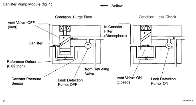 (a) Vent valve Vents and closes EVAP system When ECM turns valve ON, EVAP system closed When, ECM turns valve OFF, EVAP system vented Negative pressure (vacuum) created in EVAP system to check for EVAP leaks by closing purge VSV, turning on vent valve (closed) and operating leak detection pump (refer to Fig 4)