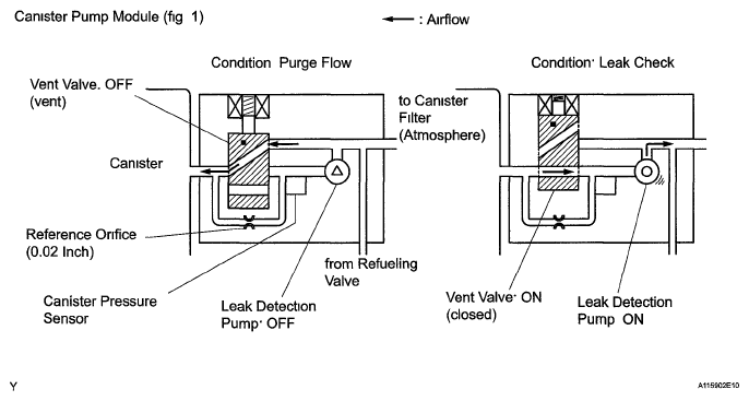 | (e) Reference orifice | Diameter is 0 02 inch Negative pressure (vacuum) is created in reference orifice to measure reference pressure by closing purge VSV, turning off vent valve (vent) and operating leak detection pump Reference pressure indicates criterion of EVAP small leak |