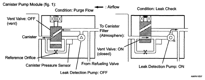 The leak detection pump creates negative pressure (vacuum) in the EVAP system and the pressure is measured. Finally, the ECM monitors for leaks from the EVAP system and malfunctions in both the canister pump module and purge VSV based on the EVAP pressure.