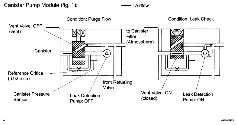 The leak detection pump creates negative pressure (vacuum) in the EVAP system and the pressure is measured. Finally, the ECM monitors for leaks from the EVAP system, and malfunctions in both the canister pump module and purge VSV, based on the EVAP pressure.