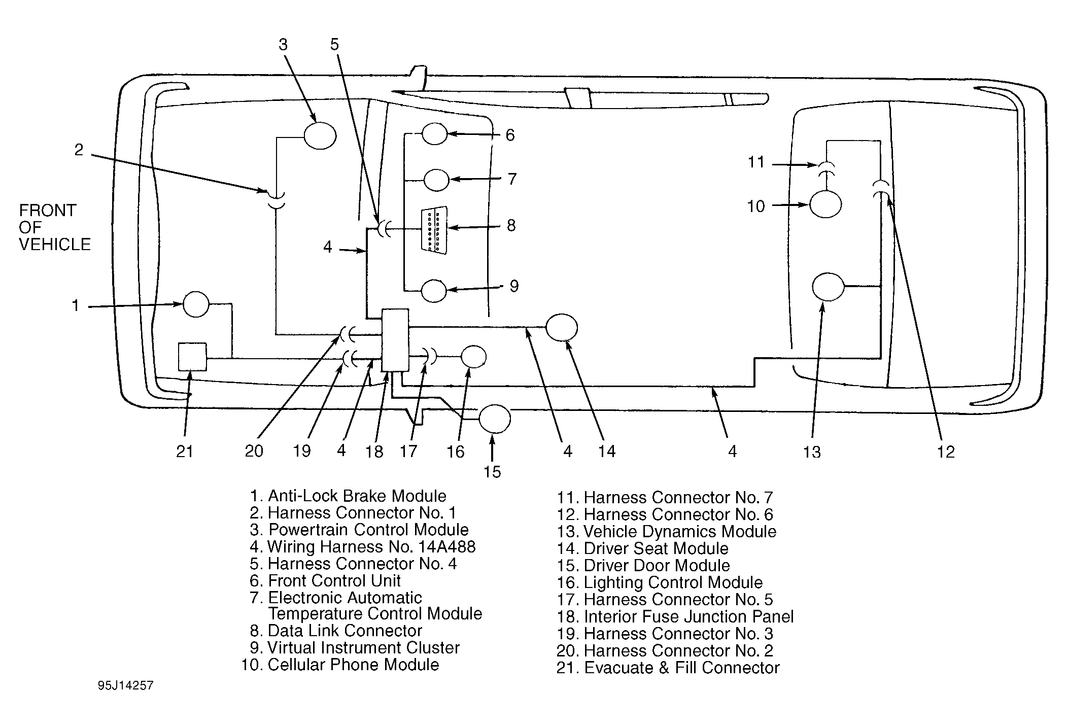 The module communications network is the means which up to 10 separate control modules can communicate with each other to carry out tasks that may require information or action from more than one module. The modules are linked to each other through a twisted wire pair called Data Bus Plus and Data Bus Minus. Data Bus Plus is also identified as circuit No. 914 (+). Data Bus Minus Is also identified as circuit No. 915 (-).