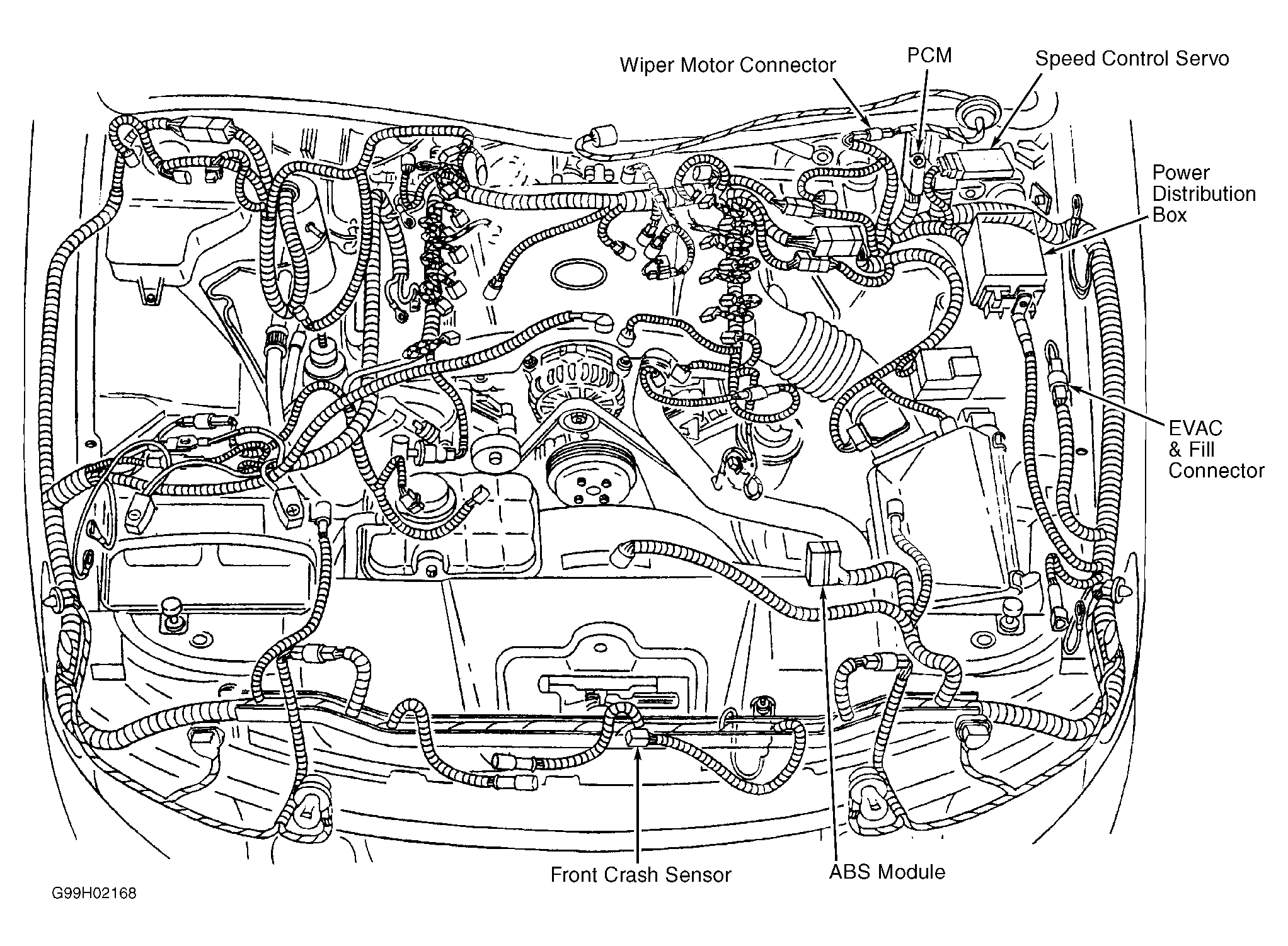 7. Turn ignition switch to LOCK position. Disconnect PCM harness connector. PCM is located in engine compartment on left side of firewall. See Figure. Using NGS tester perform data link diagnostic test. See DATA LINK DIAGNOSTIC TEST  under SELF-DIAGNOSTIC SYSTEM. If all modules equipped on vehicle except ABS module, PCM and speed control servo passed data link diagnostic test, replace PCM and test system for normal operation. If any module other than ABS module, PCM and speed control servo did not pass data link diagnostic test, repair circuit No. 914 (Tan/Orange wire) and/or circuit No. 915 (Pink/Light Blue wire) between in-line harness connector C201 and ABS module, PCM, speed control servo and EVAC and fill harness connector C133 (Tan/Orange wire only). EVAC and fill harness connector is located on left fender well. See Figure. Restore harness connections and test system for normal operation.