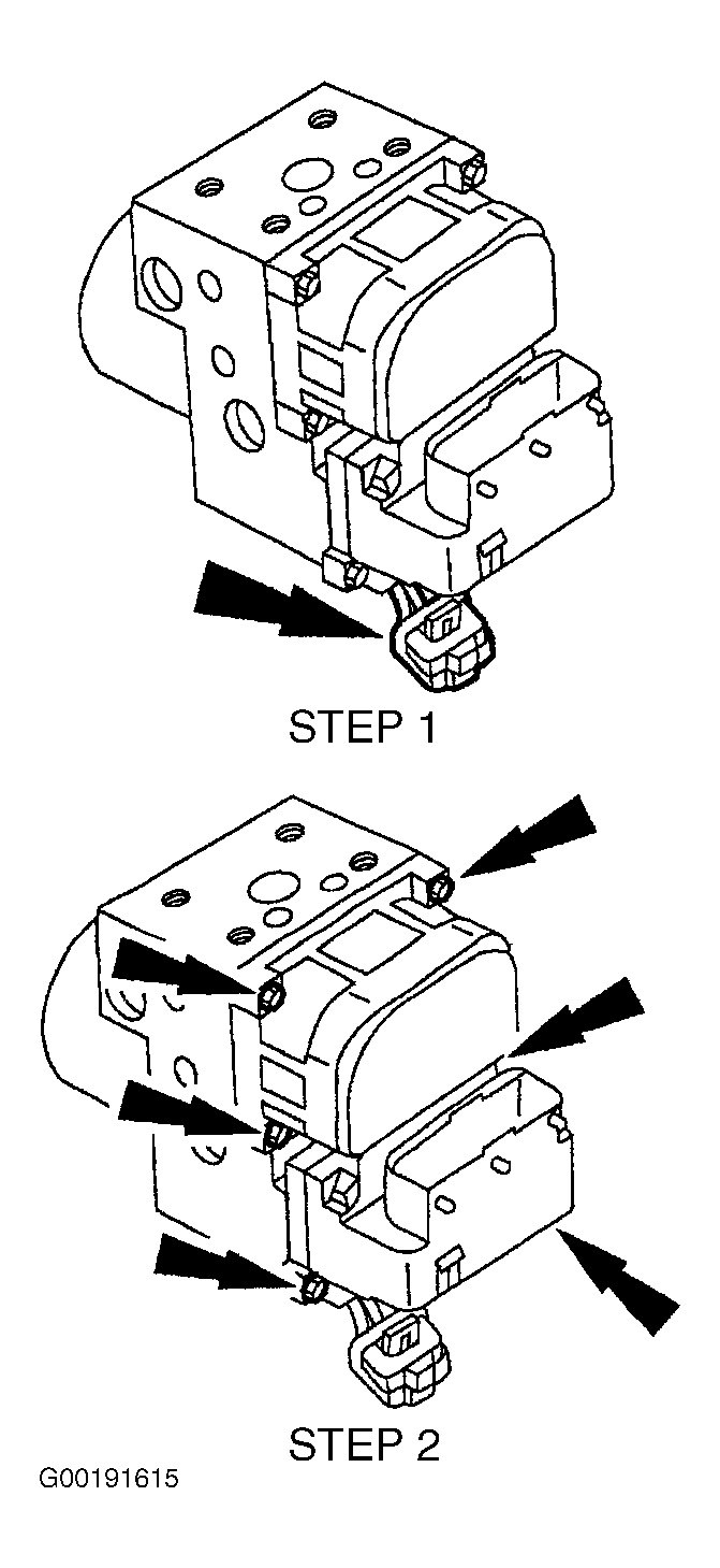 Disconnect negative battery cable. Disconnect Anti-Lock Brake Control Module (ABCM) harness connectors. See STEP 1 in Fig 1. Remove ABCM-to-Hydraulic Control Unit (HCU) screws and remove ABCM. See STEP 2 in Fig 1. To install, reverse removal procedure.