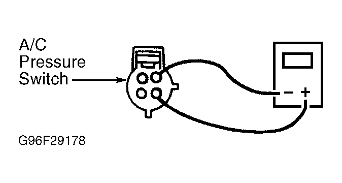 Turn ignition switch to OFF position. Using a DVOM, measure resistance between A/C high pressure switch high pressure terminals. See Fig 2. If resistance is less than 5 ohms, go to next step. If resistance is 5 ohms or more, check for overcharged A/C system. Service A/C system as necessary. If system charge is okay, replace A/C high pressure switch. See appropriate article in AIR CONDITIONING & HEATING.
