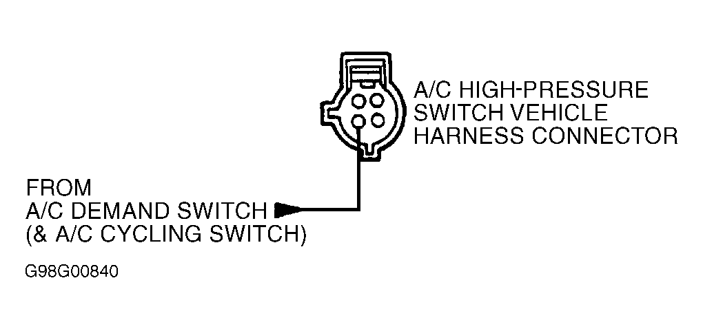 Ensure ignition switch is in OFF position. Reconnect A/C cycling switch. Disconnect A/C high pressure switch. Turn ignition switch to ON position. Turn A/C on. Using a DVOM, measure voltage between chassis ground and A/C demand switch terminal at A/C high pressure switch harness connector. See Fig 1. If voltage is more than 10.5 volts, go to next step. If voltage is 10.5 volts or less, repair open circuit between A/C high pressure switch and A/C cycling switch.