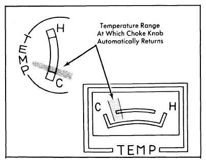- Set engine speed at 2000 RPM with choke knob. When temperature reaches range indicated in gauge, choke knob should pull back in automatically. See Figure.