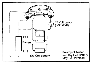 Connect the ignitor, lamp, and battery as shown in Fig 1. Using a dry cell battery or continuity tester, apply voltage to the signal input terminal of the ignitor unit. Lamp should light when voltage is applied, and go out when voltage is removed. If not, ignitor is bad.