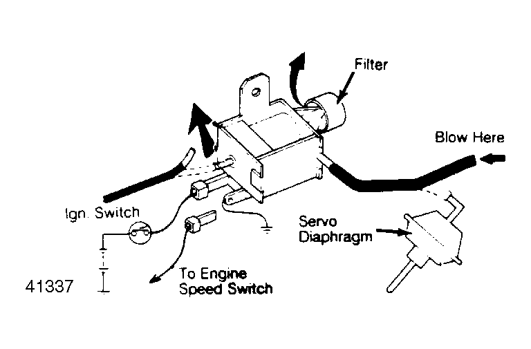 - Disconnect 12V from solenoid valve. Air blown through the solenoid valve-to-servo diaphragm hose should now come out of the intake manifold port. See Fig 1 .