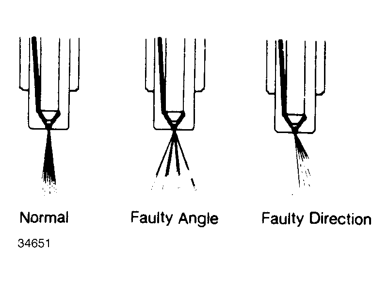 Build up pressure in the injector tester to just below injection starting pressure. Quickly lower handle on tester and observe fuel spray pattern. Fuel should be uniformly atomized and should form a narrow cone projecting straight out of the end of the nozzle. See Fig 1 .
