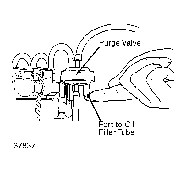 1. Disconnect purge valve-to-oil filler tube hose from purge valve. Start engine and run at idle speed. Place finger over open purge valve port and feel that no vacuum is present. See Fig 1 .