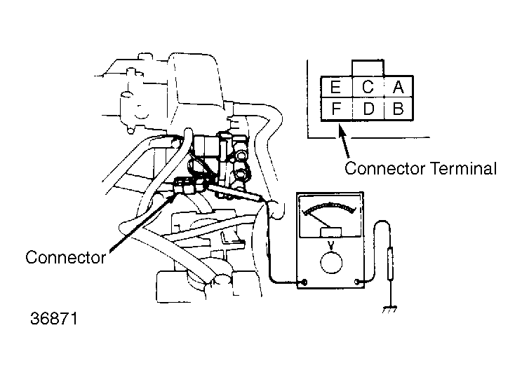 Bring engine to normal operating temperature and run at idle. With idle-up valve connector attached, use a voltmeter between terminal D and ground. See Figure . Turn steering wheel to full right or left and hold. Ensure there are zero volts. Release steering wheel and ensure 12 volts are present. If not within specifications, check P/S switch and wiring harness. See P/S SWITCH TEST in COMPUTERIZED ENGINE CONTROL SYSTEM article.