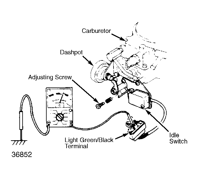 - Increase engine speed to 2500 RPM. While monitoring the voltmeter, gradually decelerate engine speed. Voltage reading should be below 1.5 volts above 1200 RPM and 12 volts at idle. If readings are not within the specifications, adjust the idle switch screw.