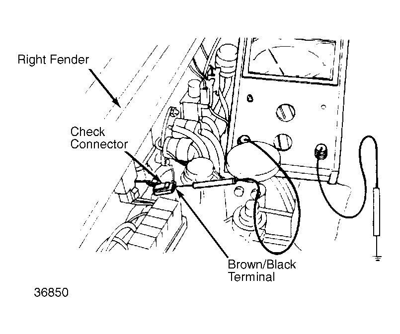 - Bring engine to normal operating temperature and run at idle. Disconnect neutral switch connector. Connect a voltmeter to the Brown/Black wire side of check connector and verify a voltage reading of 12 volts. See Fig 1 .