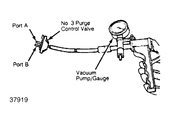 2. Disconnect vacuum hose from port "B" of No. 3 purge control valve. Connect vacuum gauge and hose to valve port. See Figure . Accelerate engine to a speed greater than 1500 RPM. Note that vacuum is present at port. If vacuum is not present, check 3-way solenoid valve, No. 3 purge control valve, and terminal "2P" at ECU.