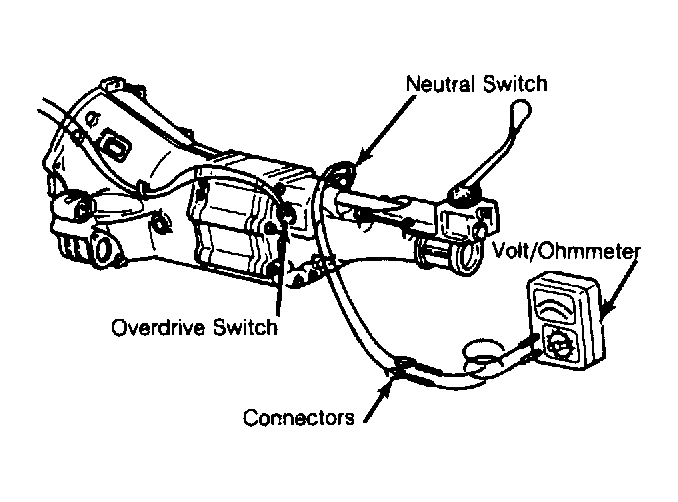 Disconnect neutral switch connector. Connect volt/ohmmeter to neutral switch, and then check continuity between switch. When transmission is in neutral, switch should be closed. When transmission is in gear, switch should be open. See Fig 1 .