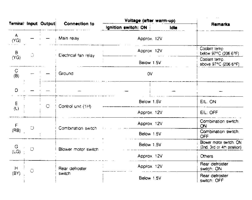 Connect a voltmeter between control unit and ground. Start engine. Check voltage at terminals using ELECTRICAL CONTROL UNIT VOLTAGE chart. See Fig 1 .