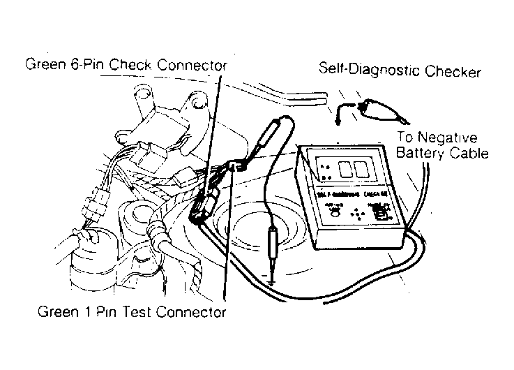 - Ground Green 1-pin connector with jumper wire. With ignition on and engine stopped, verify code 88 flashes and buzzer sounds for 3 seconds. If okay, go to step 3). If code 88 does not flash, check main relay, power circuit or harness connections. If code 88 does flash and buzzer sounds continuously for more than 20 seconds, replace ECU and retest.