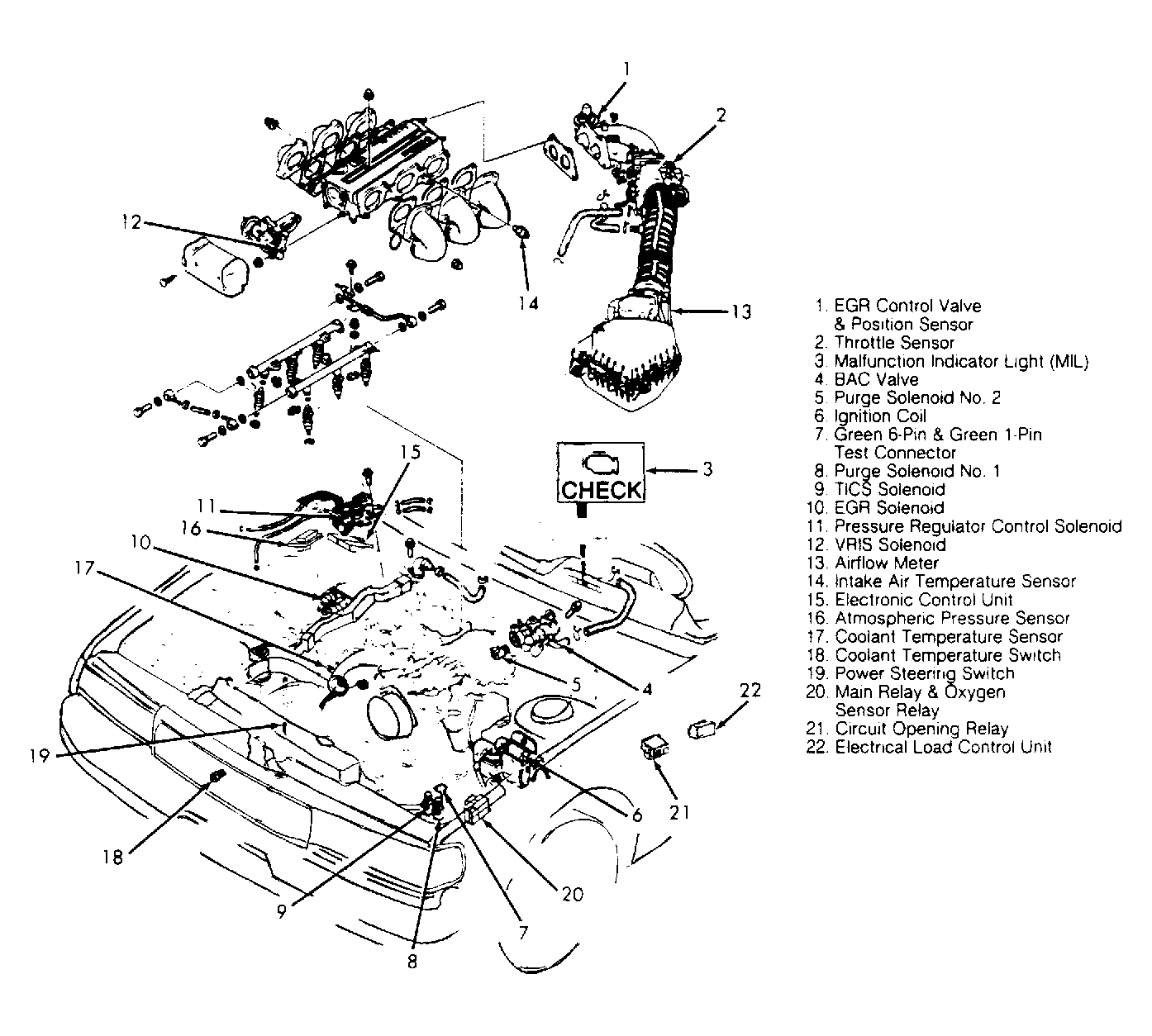 The Electronic Control Unit (ECU), through various input sensors, monitors battery voltage, engine RPM, intake air volume, cranking signal, crankshaft angle, intake air temperature, radiator and engine coolant temperatures, exhaust oxygen content, throttle position, atmospheric pressure, gearshift lever position, clutch engagement, braking, power steering operation, and A/C compressor operation. The ECU uses this input information in determining spark timing, fuel injection, and the actuation of other output devices.