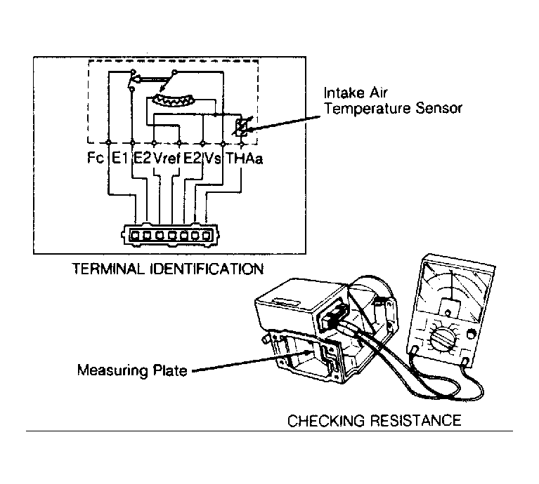 - Intake air temperature sensor and fuel pump switch are contained in the airflow meter. Determine terminal identification. See Fig 1 .