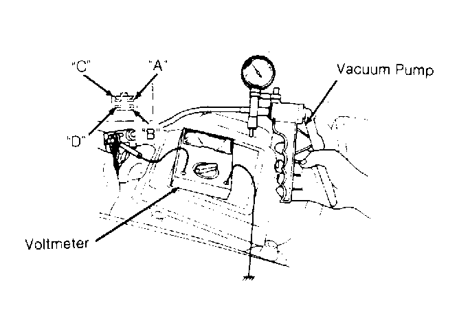 1. Disconnect vacuum hose from sensor. Connect voltmeter to "D" terminal. See Fig 1 . Using vacuum pump, apply 3.9 in. Hg to sensor.