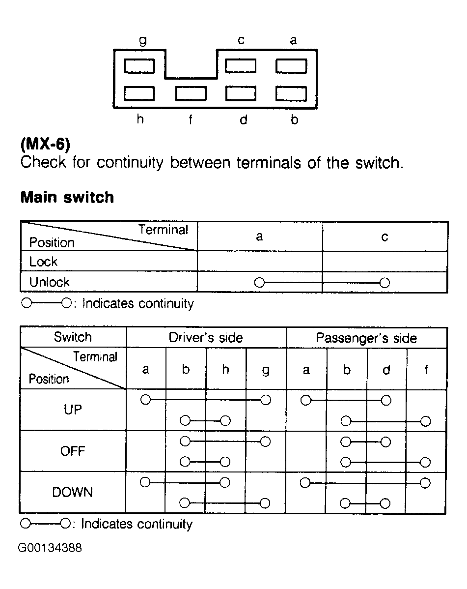 Turn ignition off. Disconnect main switch connector. Check continuity between switch terminals with switch in specified position. See Fig 1