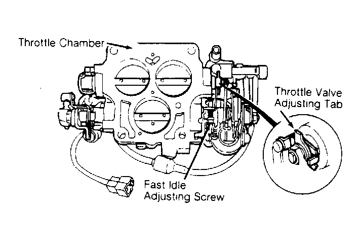 - Check clearance between primary throttle valve and throttle bore wall when No. 1 secondary valve starts to open. Clearance should be within specification. See PRIMARY THROTTLE VALVE CLEARANCE table. If clearance is not within specification, bend tab until proper clearance is obtained. See Fig 2 .