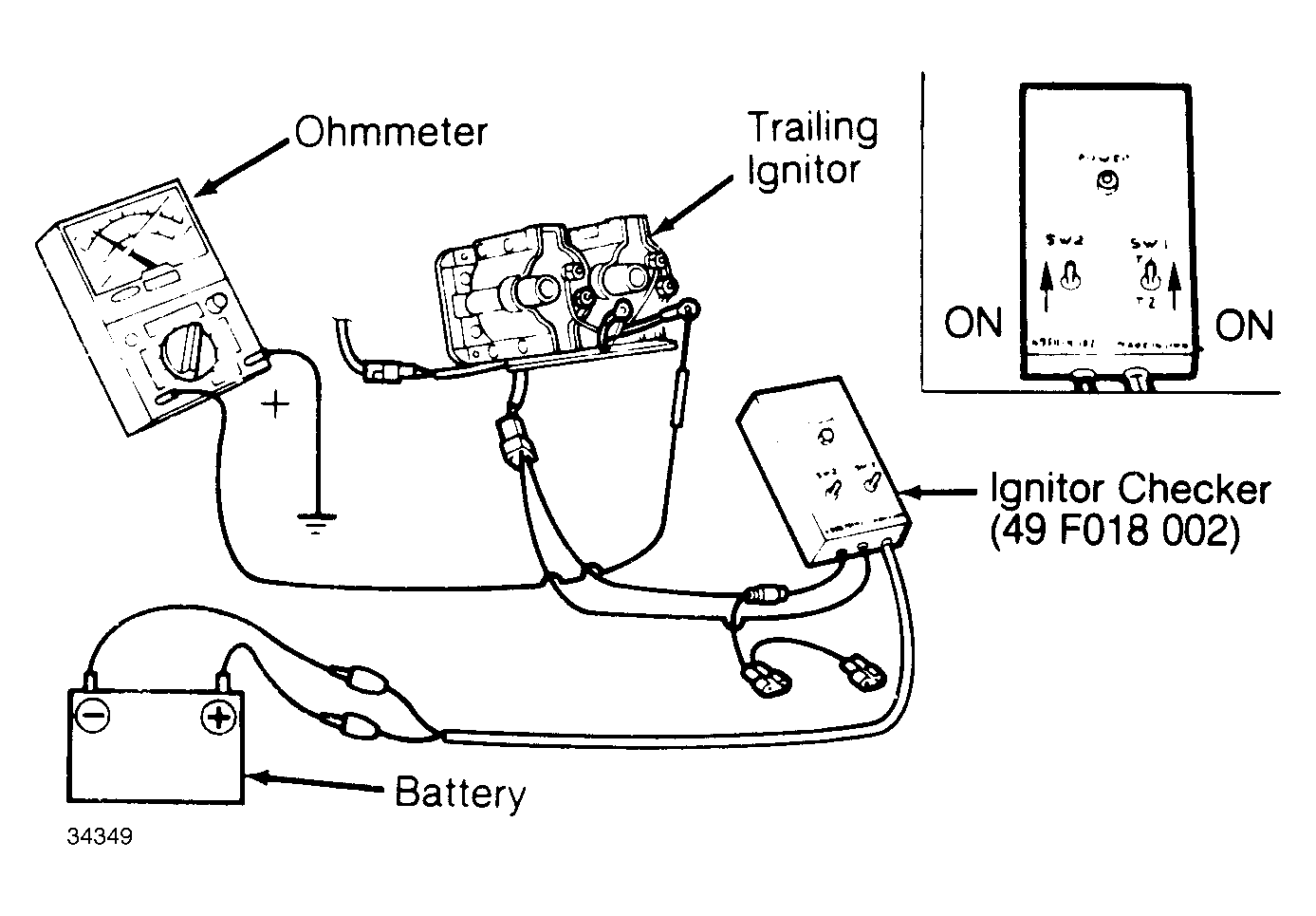 - Turn ignition on. Place ignitor checker SW1 switch to the T2 position. Hold ignitor checker SW2 switch on and note ohmmeter reading. Ohmmeter needle should rise to 1/3 the distance of the scale and then return. Replace ignitor if needle operation was incorrect.