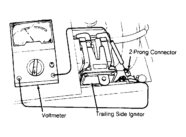 - Disconnect 2-prong connector at ignitor. Connect voltmeter (in series) between the wire terminals of 2 connector halves. See Fig 1 . Turn ignition on and note voltage.