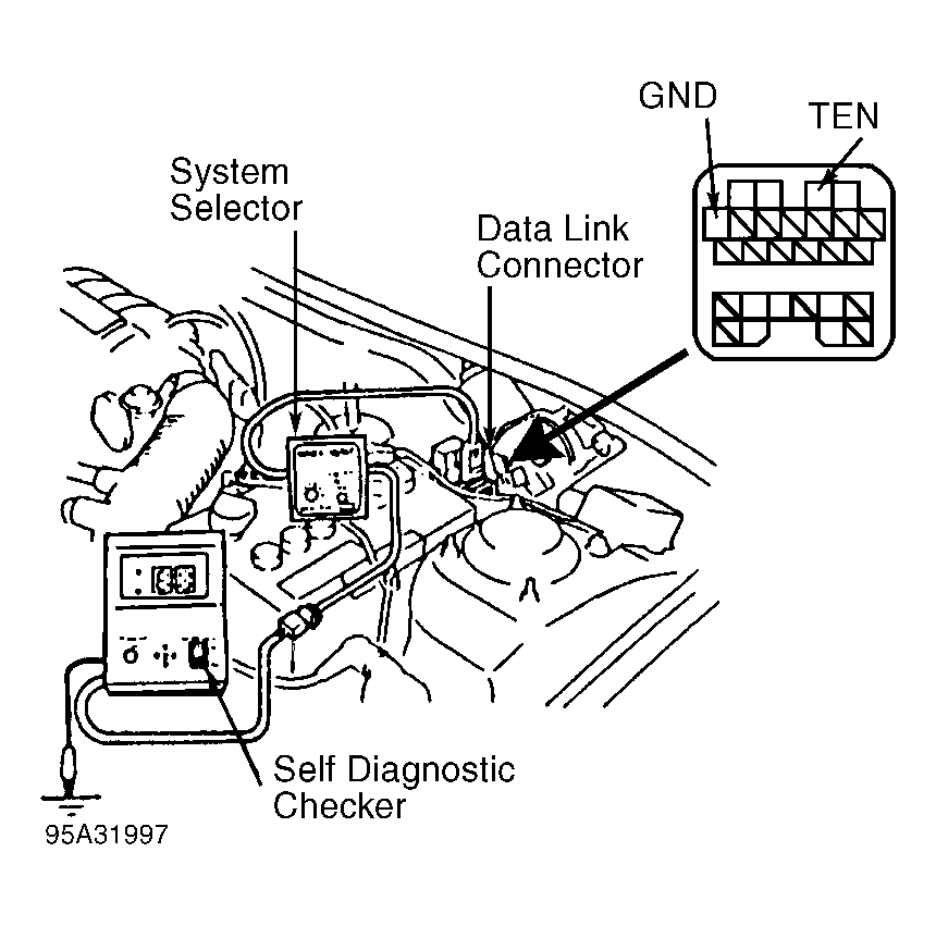 1. Use Self Diagnostic Checker (49 H018 9A1) and System Selector (49 B019 9A0) to retrieve trouble codes. Connect one lead of self diagnostic checker to ground and the other to system selector. Connect system selector to data link connector. See Fig 1 .