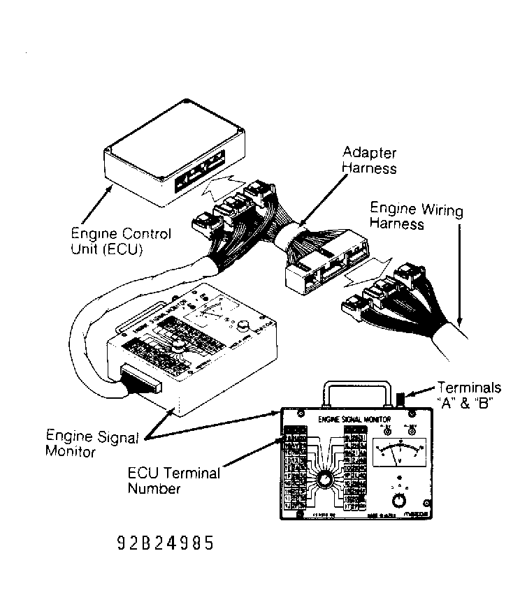 CAUTION: DO NOT apply voltage to terminals "A" and "B" of engine signal monitor. See Fig 1 .