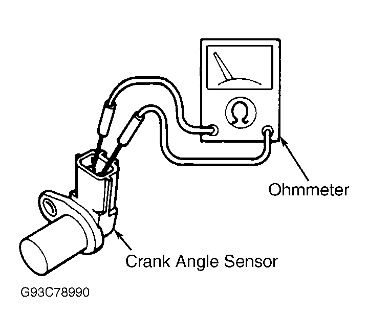 - Disconnect crank angle sensor connector. Crank angle sensor is a separate unit located at front of crankshaft. Measure resistance between terminals. See Fig 1 . If resistance is not as indicated, replace crank angle sensor.