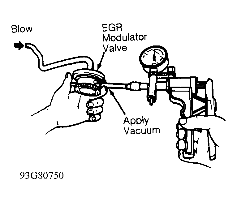 . Blow into exhaust gas port. Operate vacuum pump and verify vacuum is held. Release exhaust port and verify vacuum is released. Replace EGR modulator valve if it does not test as described.