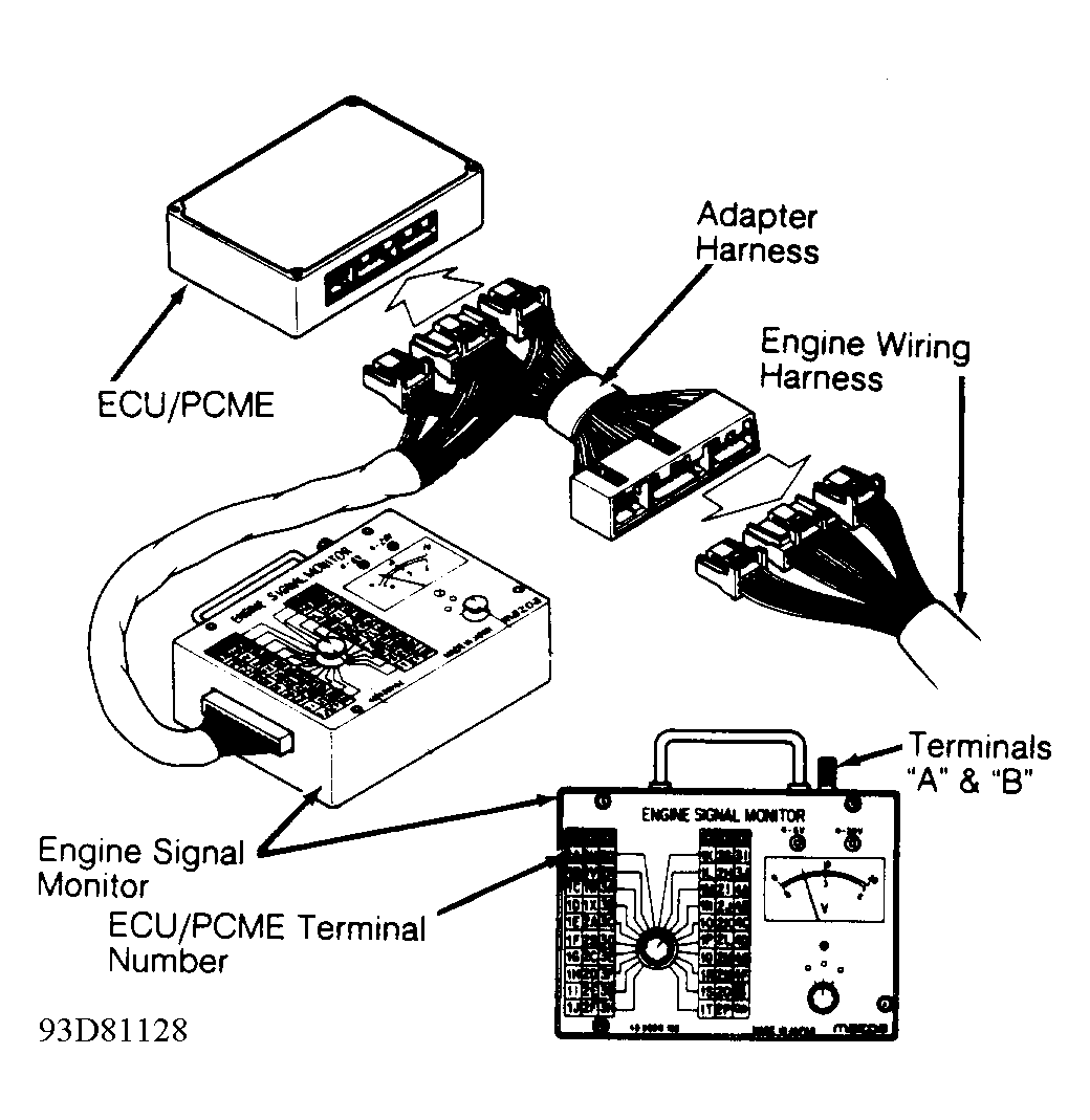 1. Locate Electronic Control Unit (ECU) or Powertrain Control Module (PCME). See ECU/PCME LOCATION table. Connect Engine Signal Monitor (49-9200-162) to ECU/PCME. See Fig 1 . Check voltage at each terminal of ECU/PCME. If input and output component voltage readings are not as specified, check faulty component. See PIN VOLTAGE CHARTS article, appropriate G - TESTS W/ CODES article below, and testing for appropriate component in this article.