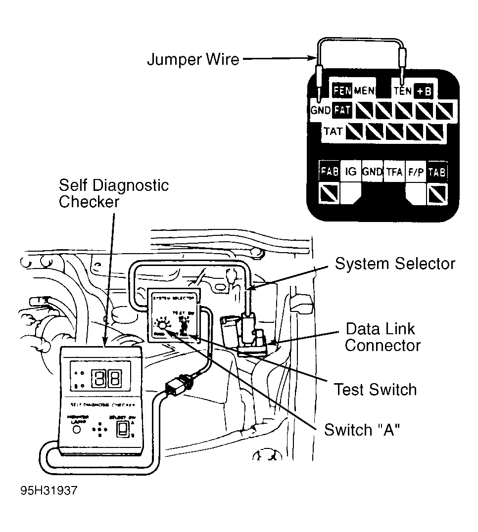 1. If system selector is not available, connect a jumper wire between terminals TEN and GND of data link connector. See Fig 1 . Observe Malfunction Indicator Light (MIL). Note trouble codes. Check TROUBLE CODE IDENTIFICATION  chart for possible cause.