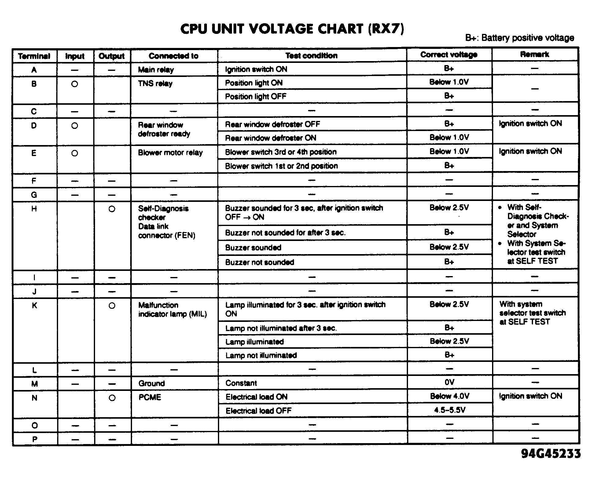 CPU acts as an electrical load sensor. Remove CPU from right side kick panel above ECU. Check voltage at terminals of CPU connector. See CPU UNIT VOLTAGE CHART. See Fig 1 . If voltages are incorrect, check appropriate circuit. If circuits are okay but voltages are still incorrect, replace CPU.