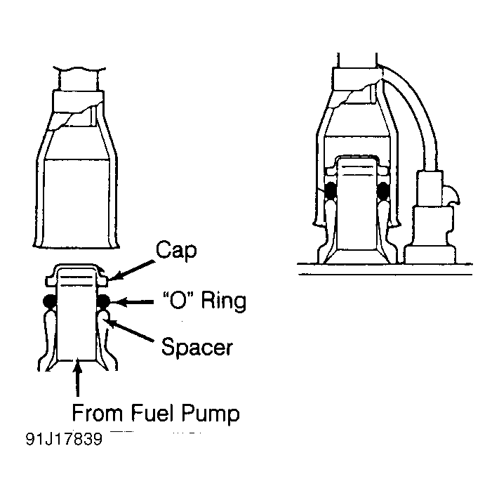 - Install fuel pump to assembly using NEW "O" ring, cap and spacer between fuel pump and outlet pipe (coat "O" ring with oil or gasoline before installing). See Fig 1 . After installing fuel pump to assembly, blow into fuel pump outlet pipe toward pump to confirm sealing of "O" ring, air should not pass.
