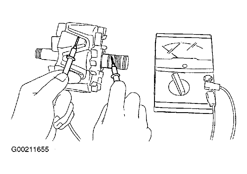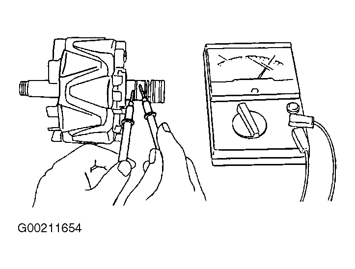 1. Using DVOM, measure the resistance between the slip rings. See Fig 1. If resistance is 2.5-2.9 ohms at 68°F (20°C), go to next step. If resistance is not 2.4-2.9 ohms at 68°F (20°C), replace rotor.