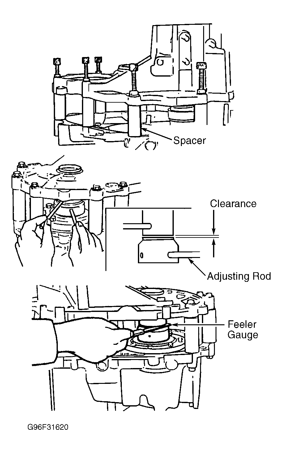 - Using feeler gauge, measure clearance of gap between selector collars. See Fig 1. Measure around entire circumference of selector. Select shims equal to maximum clearance measured. Shims range in thickness from .008" (.20 mm) to .022" (.55 mm) in increments of.002" (.5 mm).