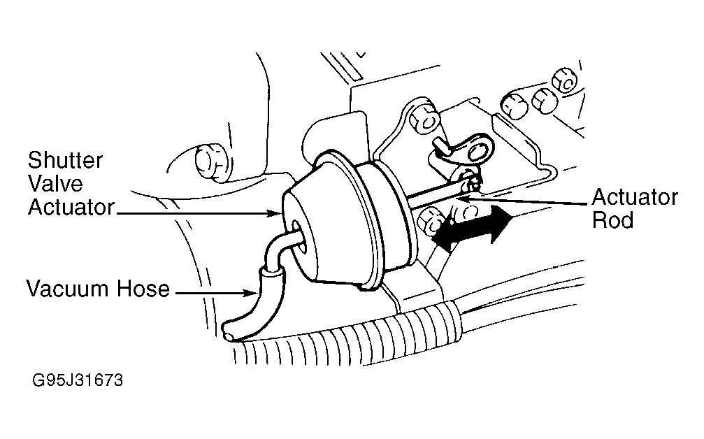 Connect tachometer to engine. Start engine, and let idle. Shutter valve actuator rod should be extended at idle. See Fig 1 . Gradually increase engine speed to 5000 RPM and ensure actuator rod retracts. If system actuator does not operate as specified, check for vacuum leaks. If no vacuum leaks are detected, check shutter valve and shutter valve solenoid.