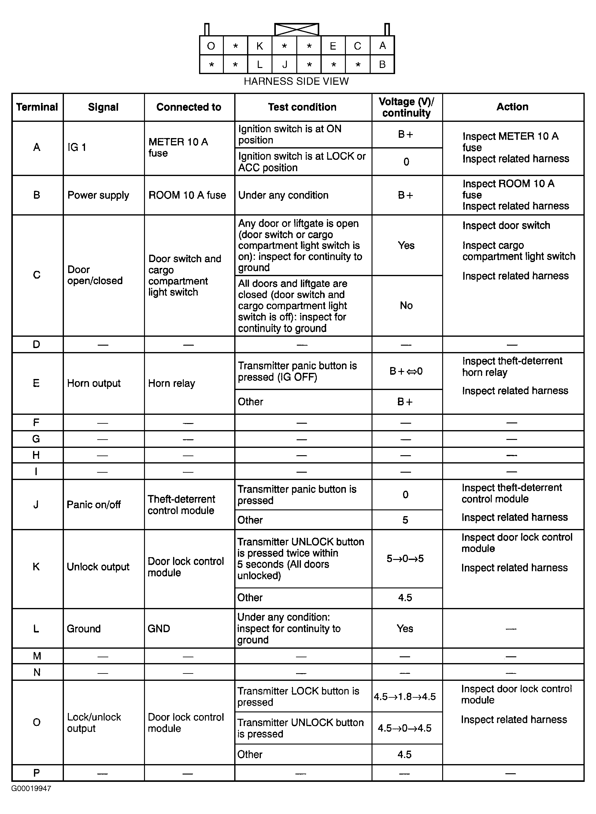 Locate keyless control module behind left rear trim panel. See Figure . Leave keyless control module connector attached. Using DVOM, backprobe specified terminals of keyless control module harness connector. See Fig 1 . Disconnect keyless control module connector before checking continuity at terminals "C" and "L". If voltage measurements and continuity checks are not as specified, check component and wiring. If component and wiring are okay, replace keyless control module. See KEYLESS CONTROL MODULE  under REMOVAL & INSTALLATION.