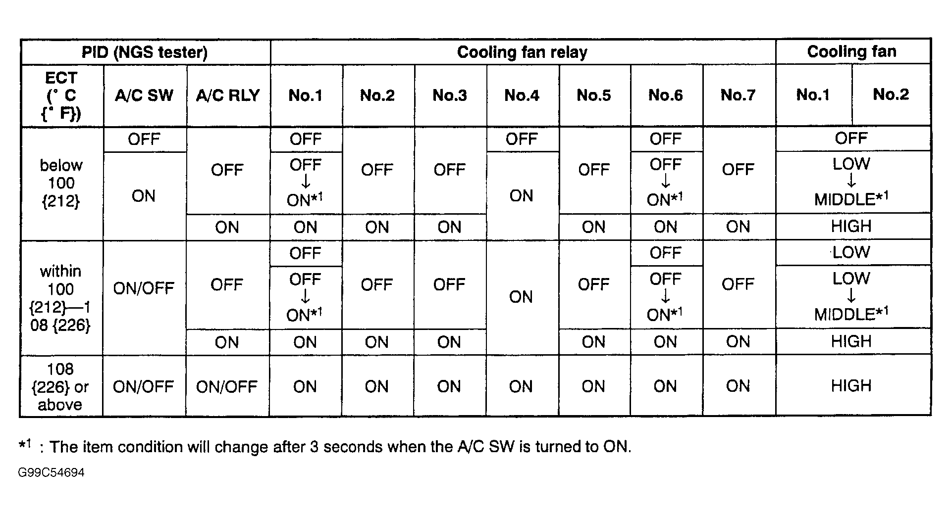 Turn engine off. Connect scan tool. Turn ignition on. Select PID/DATA MONITOR AND RECORD function. Select A/C SW, A/CP SW and ECT PIDs. Start engine. Monitor all PIDs and cooling fan operation under various conditions. See Fig 1 . Check cooling fan relays. See Fig 2 . For wiring information, see appropriate wiring diagram in WIRING DIAGRAMS article.