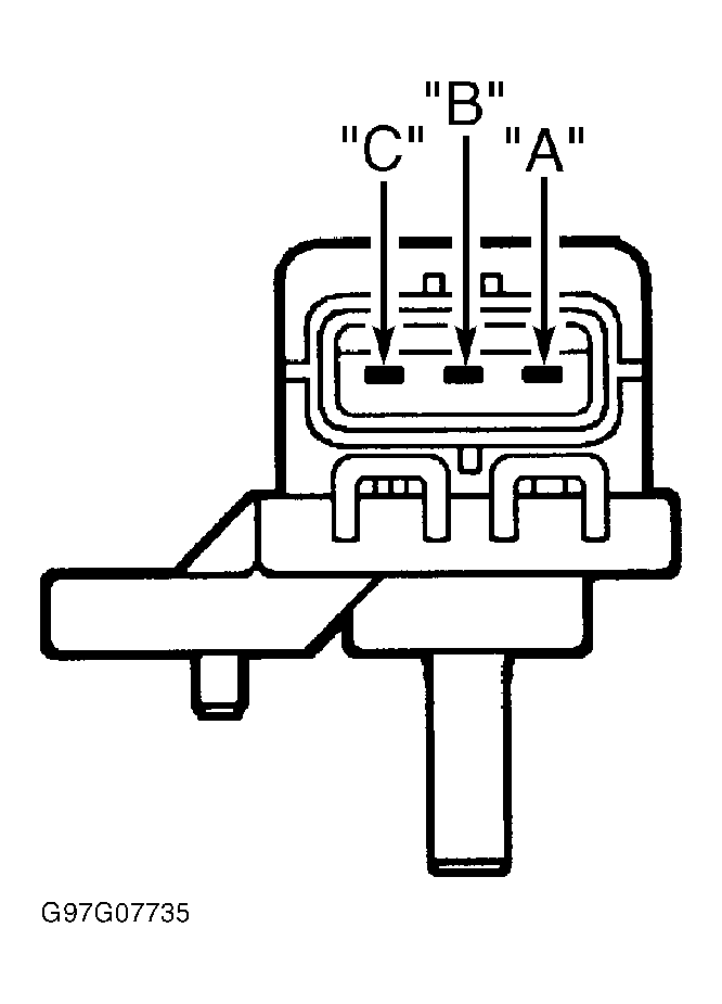 4. Turn ignition on. Measure voltage at terminal "B" at fuel pressure sensor wiring harness connector. See Fig 1 . Voltage should be less than one volt. Measure voltage at terminal "C" at fuel tank pressure sensor wiring harness connector. Voltage should be 4.5-5.5 volts. If voltage is as specified, replace fuel tank pressure sensor. If voltage is not as specified, locate and repair short circuit in wiring harness. See appropriate wiring diagram in WIRING DIAGRAMS article.