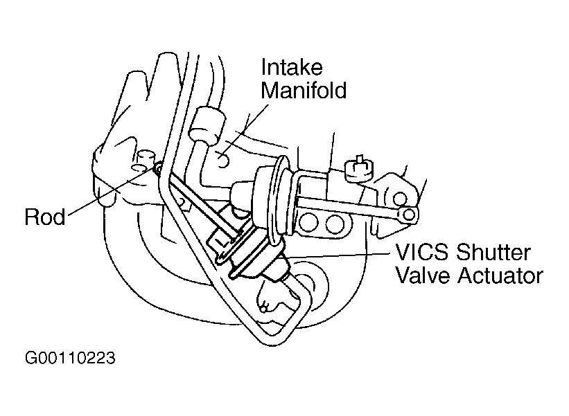 1. Start engine, and let idle. VICS shutter valve actuator rod should be pulled at idle. See Fig 1 . If actuator rod is pulled, go to next step. If actuator rod is not pulled, check following: