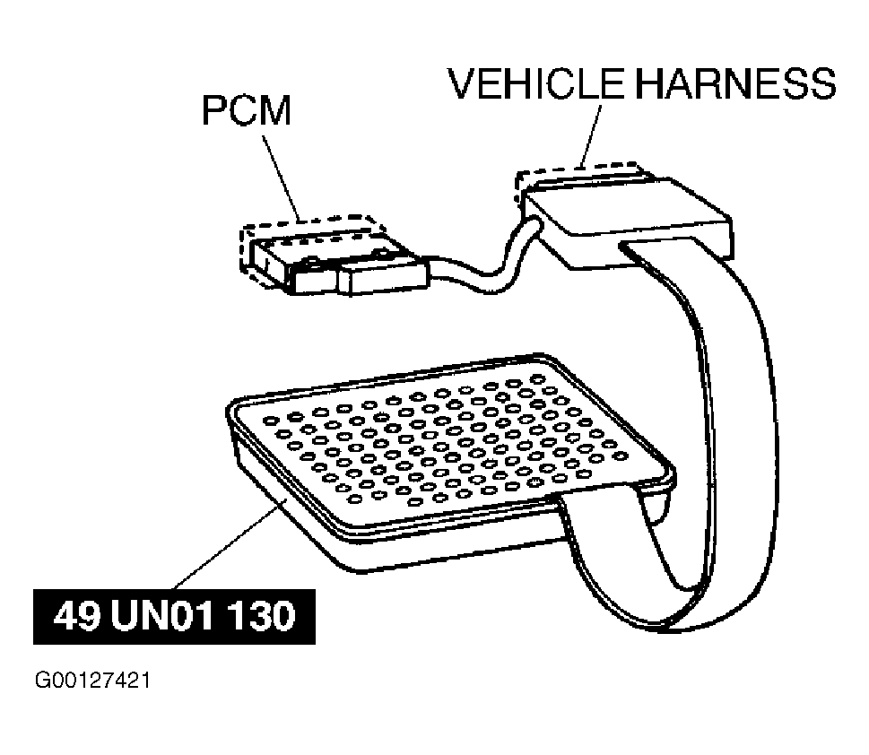 1. Disconnect PCM harness connector and install 104-Pin Breakout Box (49-UN01-130) to PCM harness connector only. See Figure . Turn ignition switch on. Disconnect vacuum hose from between EGR boost sensor and EGR boost sensor solenoid valve. Connect vacuum pump to EGR boost sensor port. Ensure PCM terminal No. 34 (terminal 3F on Millenia) voltage is 2.3-4.7 volts. Apply 7.85 in. Hg (0-24.0 in. Hg on Millenia) to EGR boost sensor and verify PCM terminal No. 34 (terminal 3F on Millenia) voltage drops to 0.8-1.3 volts.